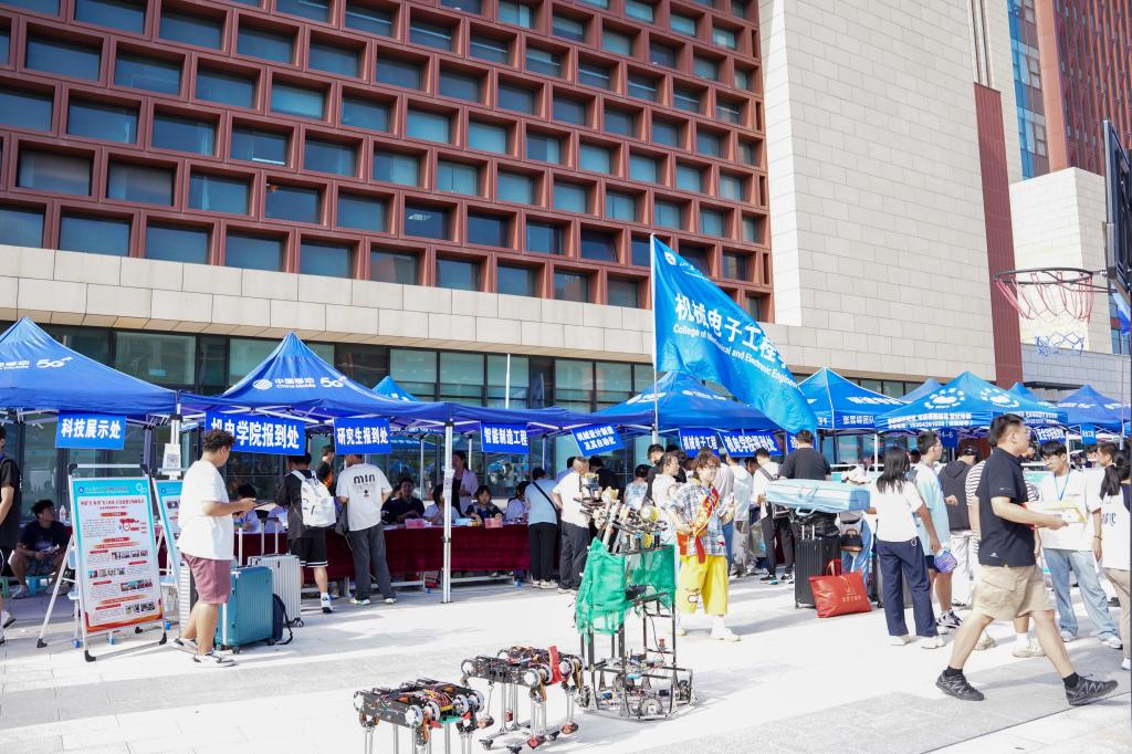 公司迎新点以“‘五’力全开,育大国‘机械+’”为主题,特别设置“五”力赋能仪式,五种颜色的彩砂分别对应“引领力、源动力、躬行力、灵动力、融合力”(公司“五维育人”核心能力),新生在志愿者引导下将彩砂倾倒入“机械+”能量仓内,寓意“五力”从此刻起融入成长血脉。此外,公司迎新点的科技展示处的机器人更是吸引了众多新生的目光,小平科技创新团队成员们为他们细心讲解,每一部投篮机器人、仿生足式机器人的背后都凝结着机电学子的心血,在新生的心中悄然种下“科创”的种子。