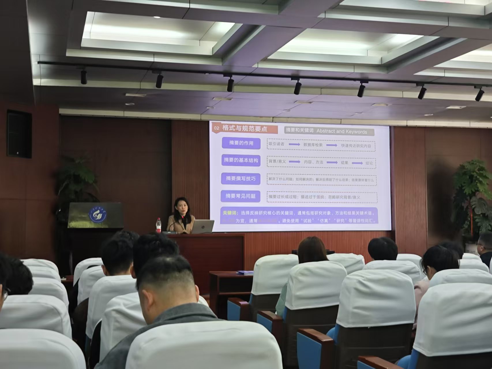 在此次报告中,张彤编审围绕科技期刊评价体系、格式与规范要点、全流程注意事项、科技论文的传播等方面展开了详细阐述。在科技期刊评价体系部分,深入剖析了数据库收录相关信息,让师生对如何评估一本科技期刊的质量有了清晰的认识,这对大家今后选择合适的期刊投稿具有重要指导意义。谈及格式与规范要点,她形象地将科技论文比作“八股文”,强调了其结构和格式的规范性,并从论文的题名、作者署名、摘要、关键词,到正文部分的层次标题、图表制作、数学式和反应式的规范表达等,逐一进行讲解。针对中英文作者在写作过程中常见的逻辑结构不清晰、语言表达不精准、图表制作不规范等痛点,给出了切实可行的建议。在全流程注意事项板块,提供了从初稿撰写到返修应答的全流程建议,并通过典型案例分析常见退稿原因,并针对这些问题给出了应对方案。她强调,在投稿前,作者应充分了解目标期刊的要求和风格,精心打磨论文;在面对审稿意见时,要以积极的态度认真回复,合理吸收建设性意见,从而提升稿件质量,助力科研团队提升稿件录用效率。最后,在科技论文的传播方面,张彤编审分享了如何让科研成果得到更广泛的关注和引用。她指出,除了论文本身的质量,选择合适的期刊、优化论文的标题和摘要,以及积极参与学术交流活动等,都有助于提高论文的传播度。