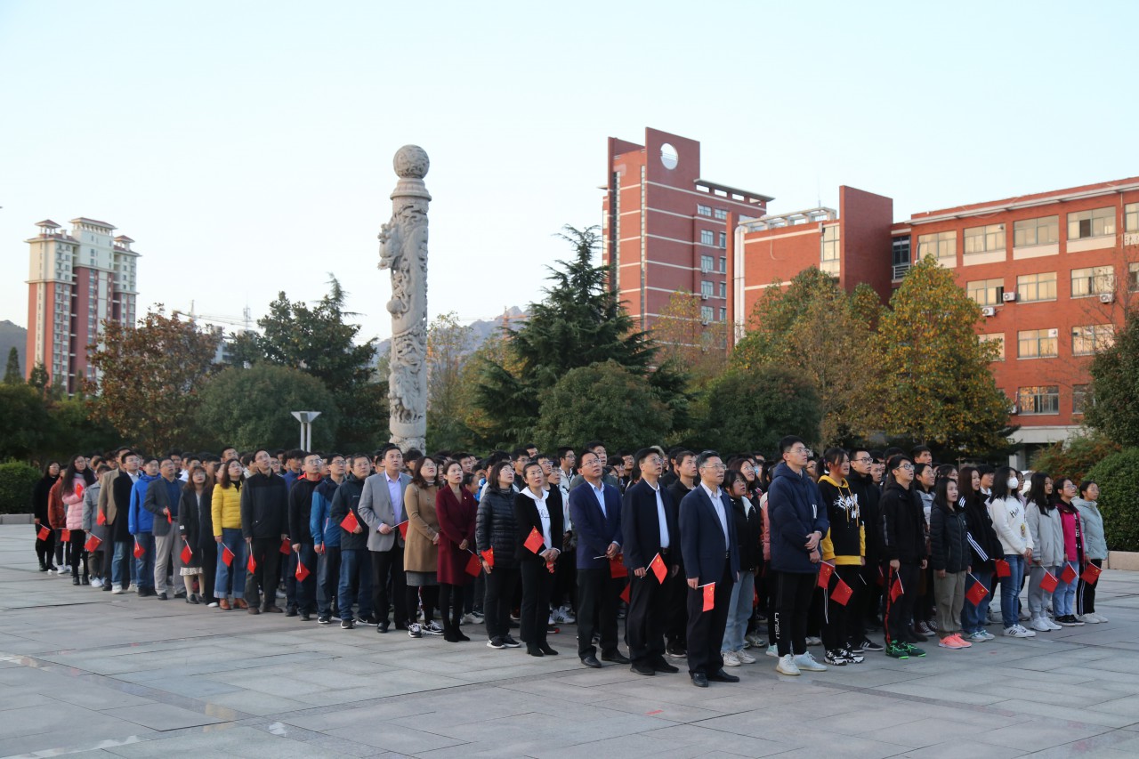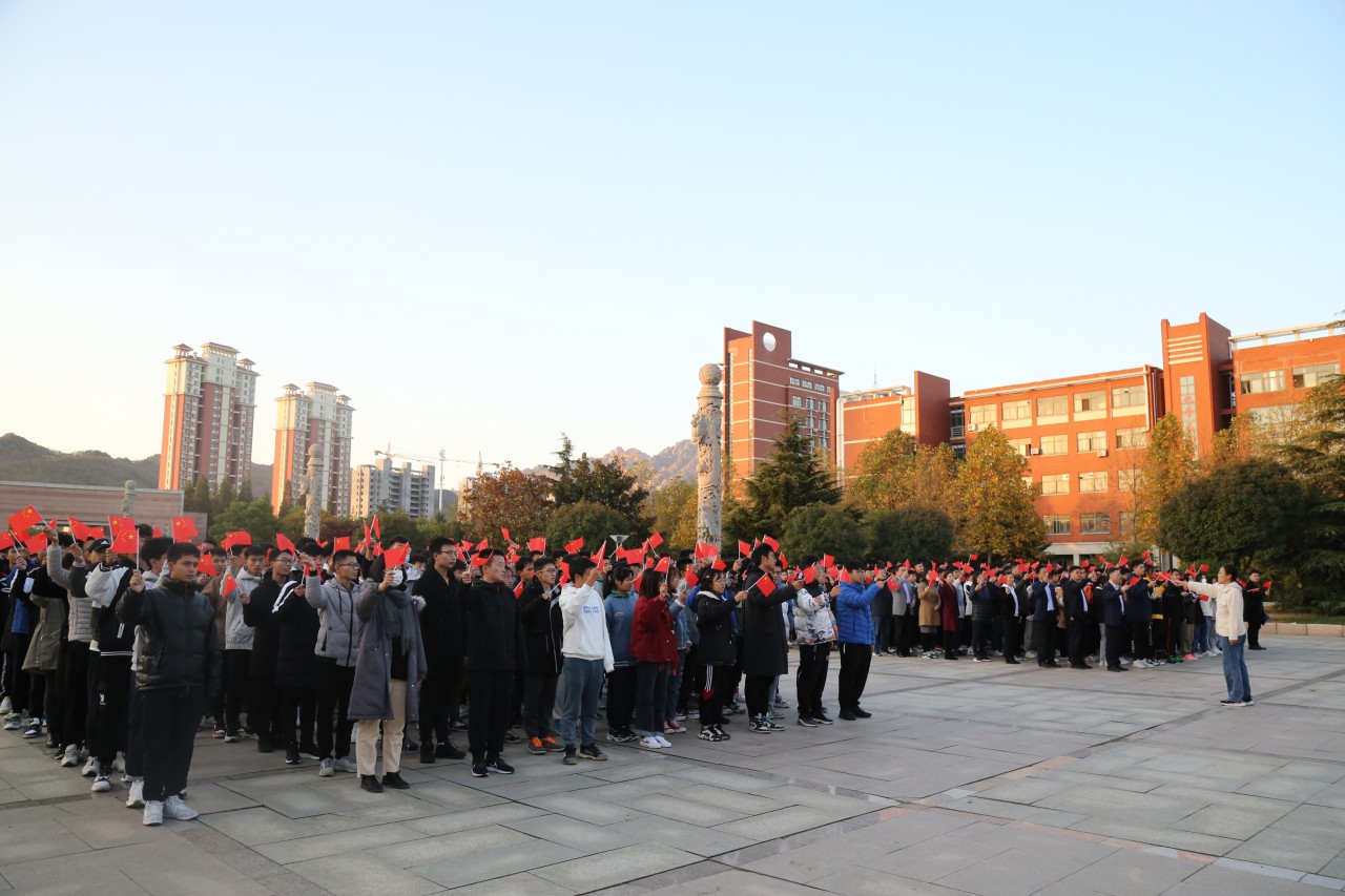 6:20,伴随着清晨的第一缕阳光,升旗仪式正式开始,国旗护卫队的旗手们整齐划一地护送着五星红旗入场。伴随着庄严的国歌,五星红旗冉冉升起,飘扬在泰山广场上空,全体师生向国旗行注目礼,高唱国歌。