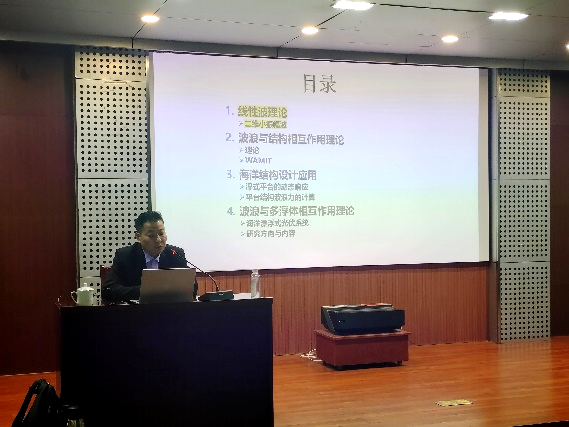 张强对黄志明的研究领域、学术成果以及参与的科研项目做了简要介绍,并强调了本次讲坛的重要性。讲座中黄志明对运用线性波理论做了讲解,分析了波浪运动控制方程在求解的过程中的两个难点和解决方法,让同学们对线性波理论有一个清晰的认识。他简单介绍了海洋结构设计应用的前景并确定海洋工程结构在风、浪、流等环境因素联合作用下的设计载荷及响应,通过对现在海上油田以及深海采矿等一系列的先进开采技术的举例,讲述了波浪与结构相互作用理论,指出现代海洋结构设计应用还有很广阔的发展前景。最后,他对波浪与多浮体相互作用理论做出阐述,并指出波浪相互作用理论体系是目前海洋油田开采技术中的海洋浮式设计的基础。