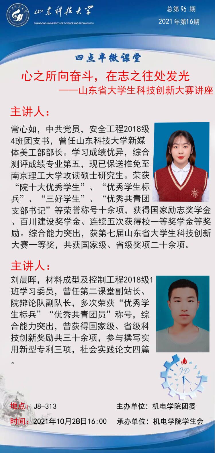 点击:为了激发员工对科技创新的兴趣,提升参赛能力,10月28日下午,伟德victor1946网站在j8-313举办了“心之所向奋斗,在志之往处发光”山东省老员工科技创新大赛讲座暨第95期四点半微课堂,安全公司安全18-4班团支书常心如、伟德victor1946网站材料18-1班学习委员刘晨辉担任主讲人。
