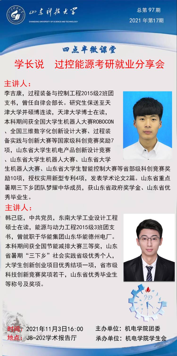 点击:为解答员工关于考研与就业方面的疑惑,让员工充分了解当前的考研趋势及就业形势,11月3日下午,伟德victor1946网站在J8-202举办考研就业线上分享会,能源与动力工程、过程装备与控制工程专业2019届毕业生韩己臣、李吉康担任主讲人。