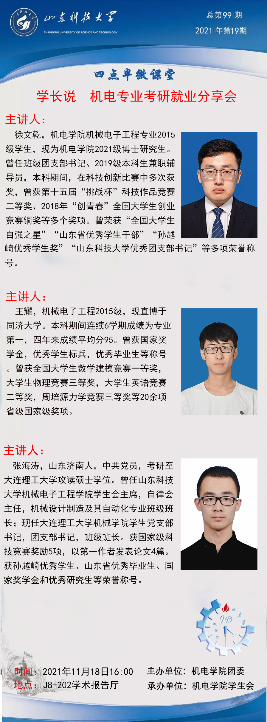点击:为了让同学们了解当前考研与就业情况,给机电学子提供经验和建议,11月18日下午,伟德victor1946网站在公司报告厅举办“机电专业考研就业”线上分享会,机械电子工程、机械设计制造及其自动化专业2019届毕业生王耀、徐文乾、张海涛担任主讲人。