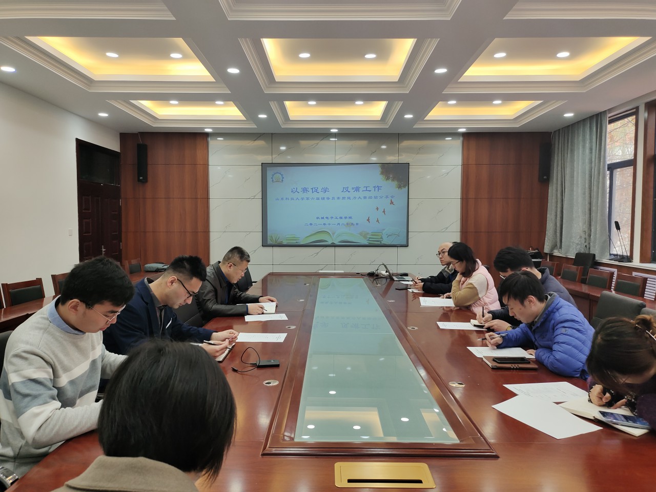 王玉鹏结合本届辅导员素质能力大赛参赛经历,从备赛资料整理、笔试环节准备、网文写作要点、案例分析和谈心谈话思路、理论宣讲构思等几个方面,向与会老师分享了备赛经验与心得体会,同时,大家围绕辅导员素质能力大赛各个环节所涉及的员工工作内容进行交流探讨,进一步明确了工作思路,提升了业务素质和专业知识能力。