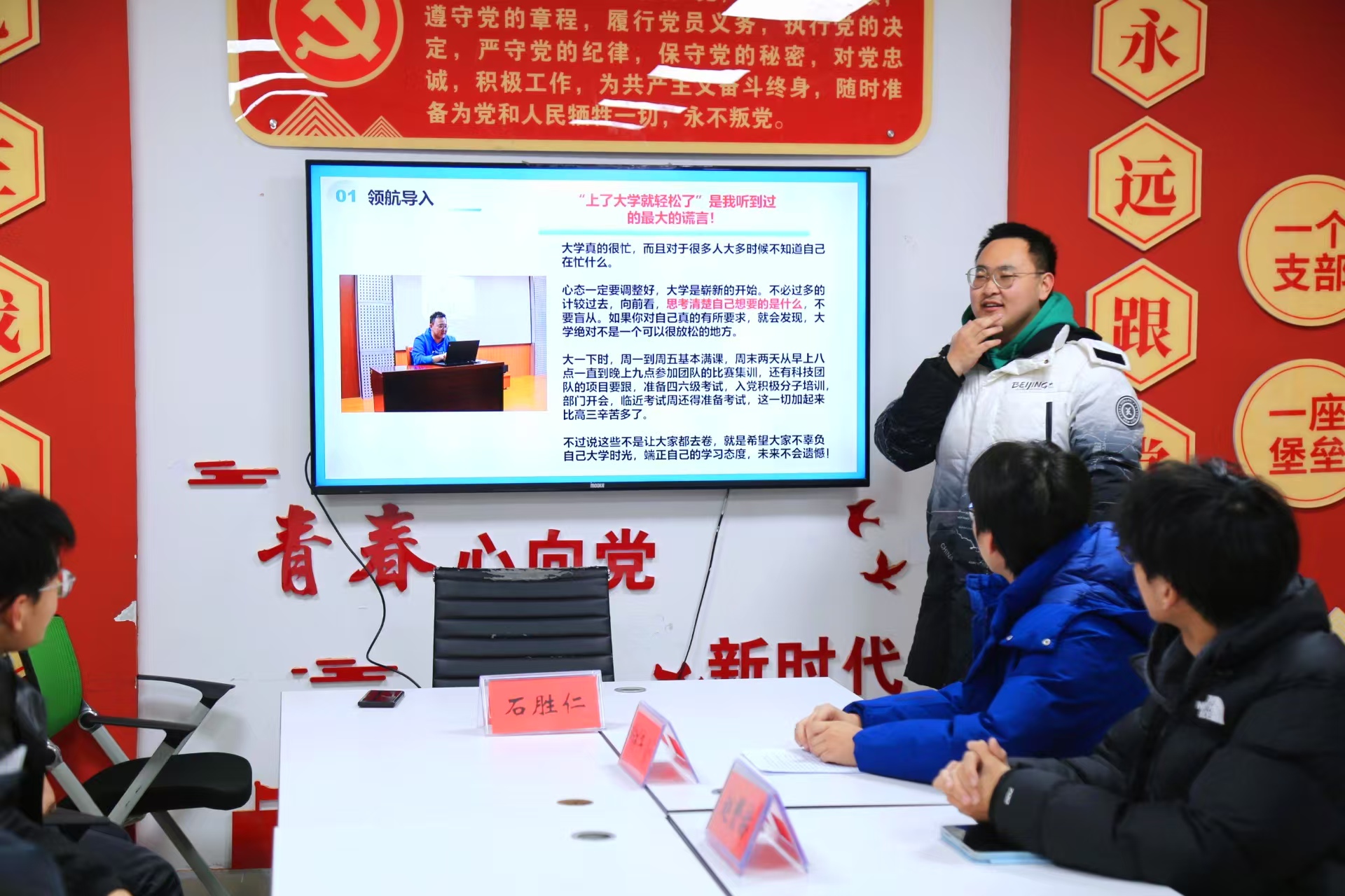 会议上,四位优秀员工代表向在场的同学们分享了自己的成长历程和宝贵经验。杨子豪同学以“目标是灯塔,坚持是船桨”为题,分享了他如何设定目标并坚持不懈地在学术和科研的道路上追求卓越。石胜仁同学以“拼搏奋进——勇敢的人先享受世界”为题,介绍了自己的成长经历,同时分享了自己的大学规划和未来目标。张凯媛同学则以自己的经历为例,讲述了坚持不懈和努力学习的重要性。赵赟赫同学则强调了时间管理的重要性。