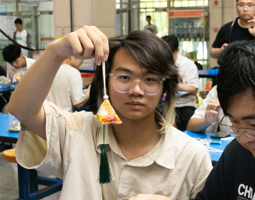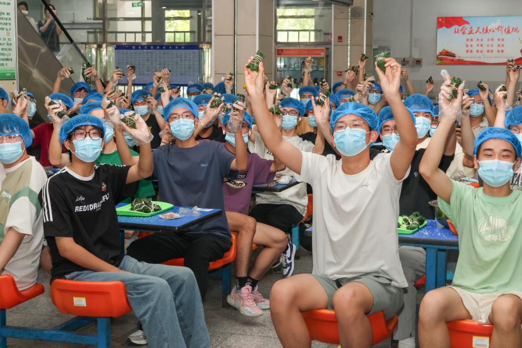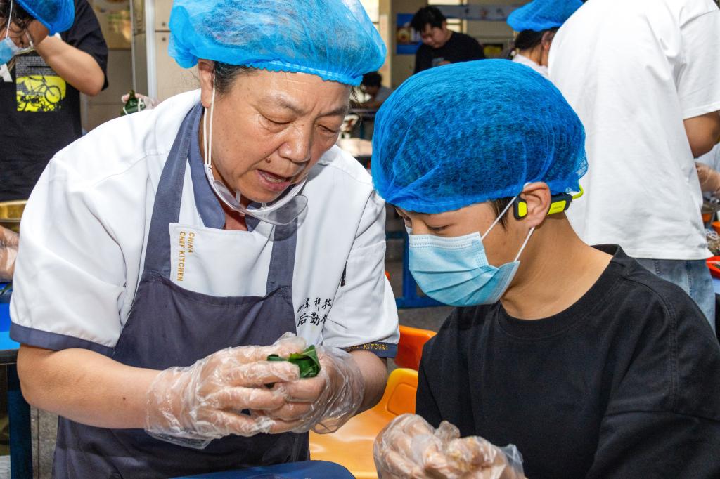 在“粽艺匠心”环节,餐厅厨师现场教学,师生们在厨师的指导下,捋叶成鞘、填糯压实、裹叶定型、棉线捆扎。指尖翻飞间,一个个棱角分明的传统四角粽诞生了。糯米的清香与现场的欢声笑语交织在一起,构成了一堂生动的民俗课堂。
