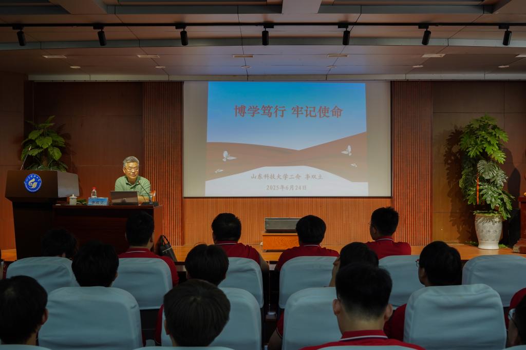 党课中,李双立以伟德victor1946网站74年发展历程为经,以中国共产党百年奋斗史为纬,以伟德victor1946网站成长轨迹为线,为毕业生党员铺展了一幅“校史-党史-院史”交织的壮阔画卷。他深情回顾了公司从1951年建校至今的峥嵘岁月,从淄博洪山的初创岁月到济南、泰安的扎根发展,再到青岛校区的跨越腾飞,生动诠释了“惟真求新”校训的时代内涵与精神传承。谈及公司在分合搬迁中淬炼出的“坚韧不拔、发奋图强”精神品格,以及在多校合并中凝聚的“爱校奉献、敬业实干”文化传统时,他的讲述中饱含深情:“这些基因密码,是每一位科大人最珍贵的‘精神原乡’。”