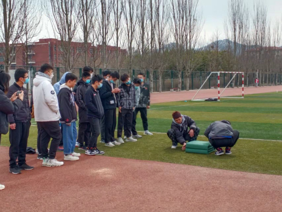 “我来教大家打军体拳!大家跟我做!”几天后,退伍老兵们发现部分员工因常待宿舍无精打采,为了增强同学们的身体素质,提高免疫力,严利君结合在部队学习到的科学训练方法组织同学们在高地操场进行军体拳、俯卧撑、深蹲、慢跑等一系列的体育锻炼。吴彪、袁龙则在操场上为同学们讲解示范叠军被,引导同学们做好内务整理与统一,确保宿舍环境清洁规整,帮助同学们树立正确的学习和生活态度。张鹏等退伍老兵积极响应国防先锋营的志愿者活动,脱下迷彩服,换上防疫服,在核酸检测现场维持现场秩序,保证检测工作的有序进行。