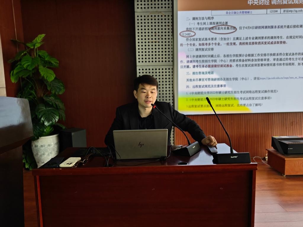 会议伊始,李有才从以下五个方面进行讲解:一是考研进入复试后该如何抢先一步联系导师;二是摸透导师遴选研究生的法则——省力法则;三是压线进入复试后,如何绝境反杀低分上岸;四是如何利用信息差优先调剂上岸;五是面试过程中千万不要触碰的大忌。随后,李有才就公司员工的可调剂院校的专业情况作了详细介绍,并对2023届毕业生考研形势作了初步分析,鼓励同学们要重视调剂。最后,李有才对伟德victor1946网站的所有考研学子送上衷心的祝福。